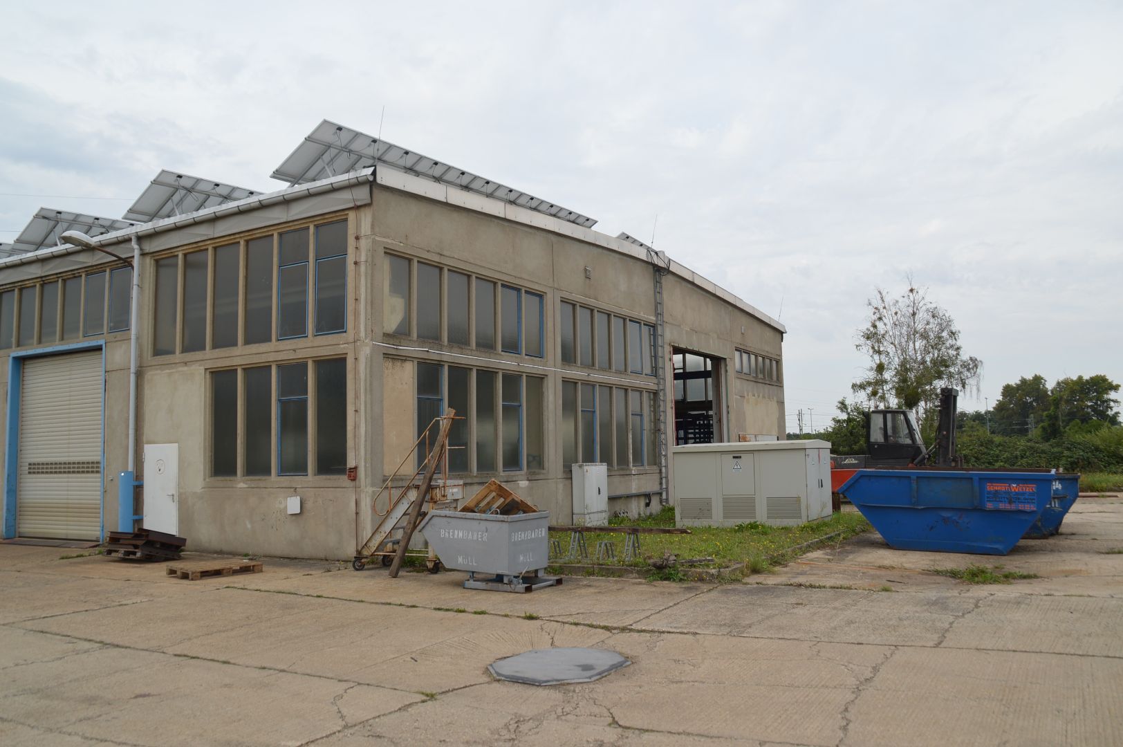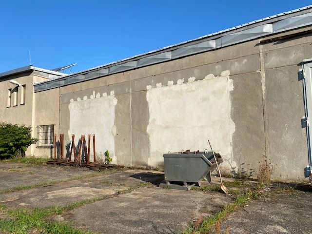 - Bei der zum Verkauf stehenden Liegenschaft handelt es sich um eine zweischiffige Produktionshalle mit seitlichem Anbau. Das Grundstück ist dreiseitig eingezäunt und verfügt über zwei Zufahrten. Auf dem Grundstück befinden sich umfangreiche befestigte sowie unbefestigte Verkehrs- und Lagerflächen, eine Trafostation sowie eine unterirdische Fernwärmeübergabestation in Fremdeigentum.