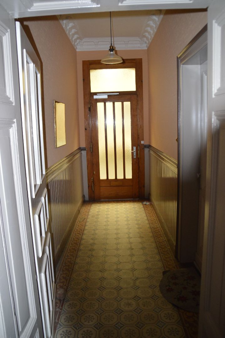 - Flurbereich Erdgeschoss: halbhohe Holzvertäfelung, Fliesen (augenscheinlich historischer Bestand), Stuck