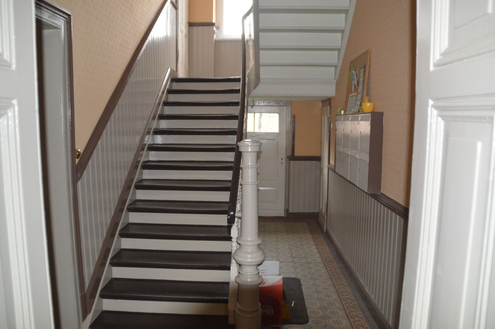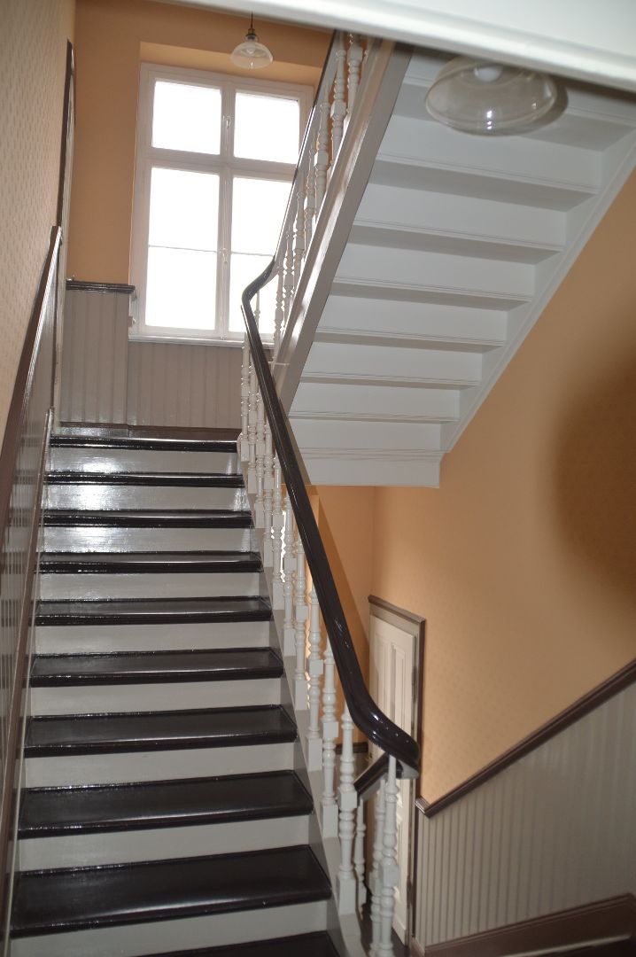 - Treppenhaus mit halbhoher Holzvertäfelung, Holzinnentreppe