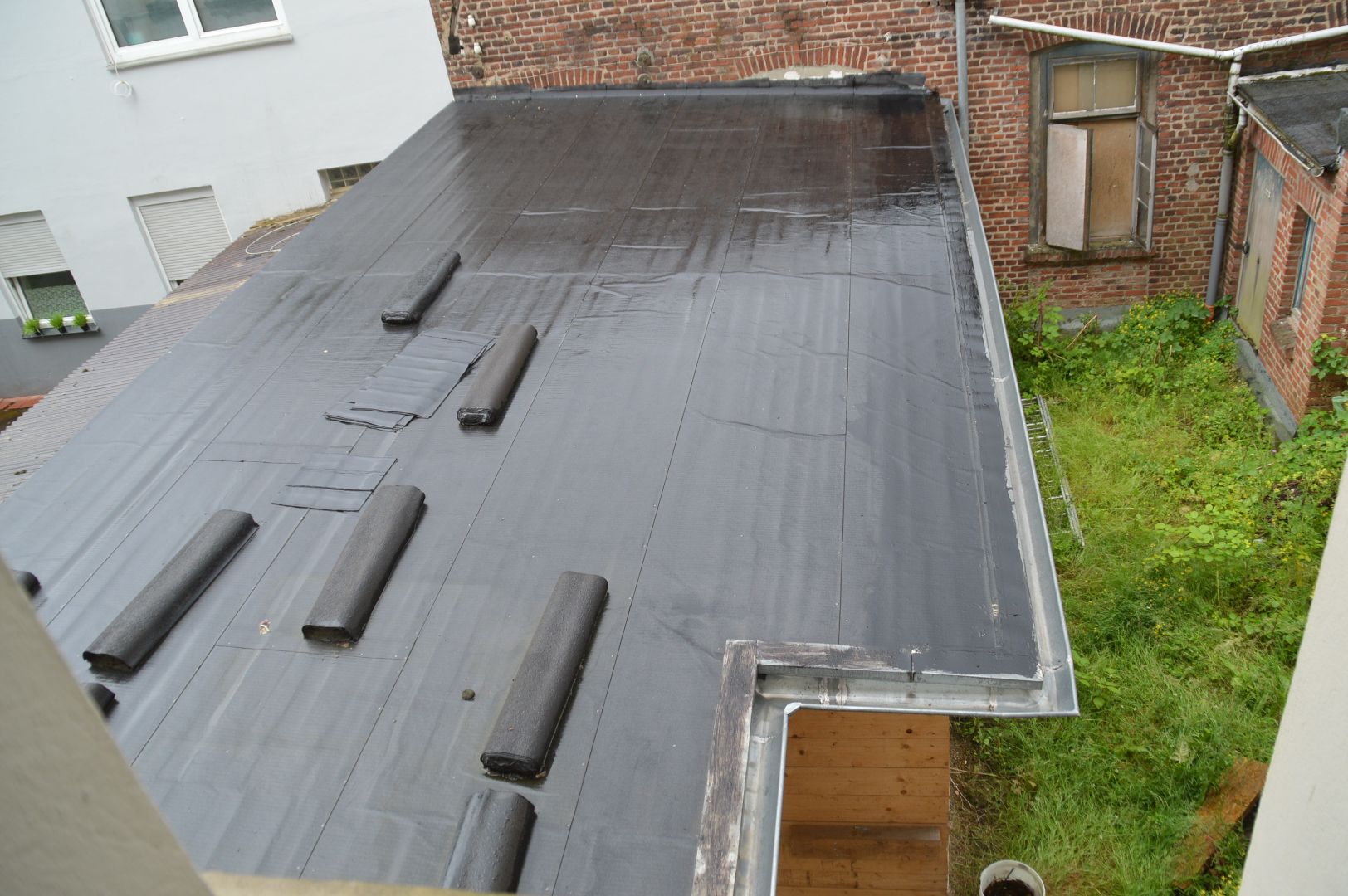- Sheddach, teilweise mit Industrieverglasung und Bitumenbahn-Eindeckung