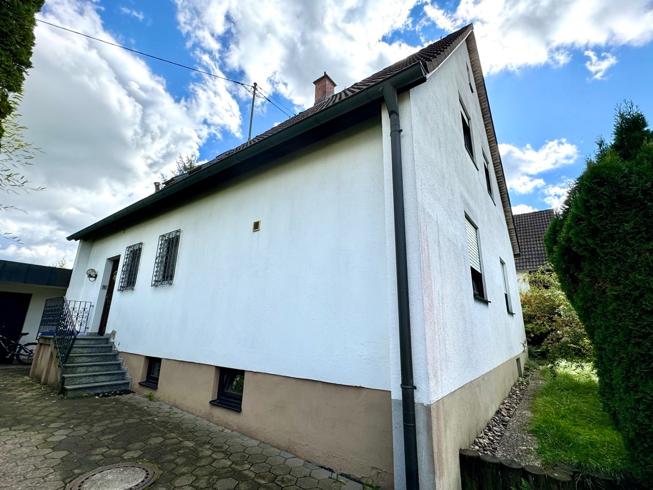- Bei der zum Verkauf stehenden Liegenschaft handelt es sich um ein 594,00 m² großes Grundstück, welches mit einem 2-Familienhaus nebst massiver Garage mit Vordach bebaut ist.