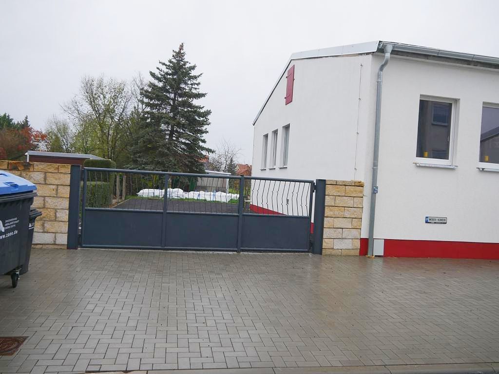 - gepflasterte und betonierte Verkehrs- und Stellplatzflächen, unbefestigte Flächen auf Schlacke, Freilagerflächen, Einfriedung über Maschendrahtzaun, zwei manuell zu bedienende Metalltore zur Zufahrt