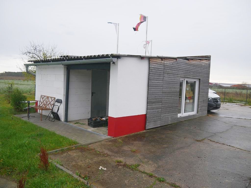 - massiver, eingeschossiger Aufbau, nicht unterkellert, Pultdach mit Trapezblecheindeckung