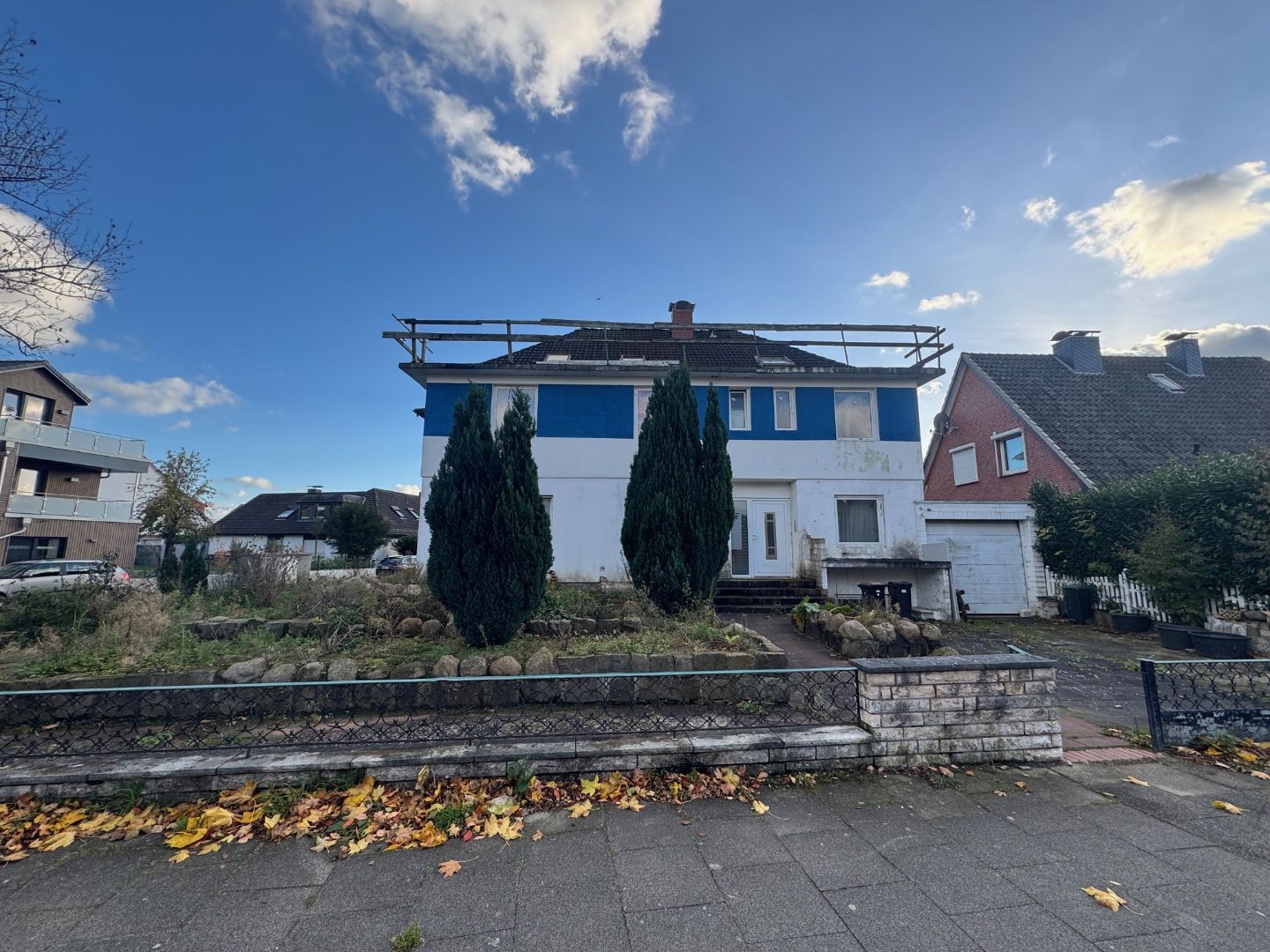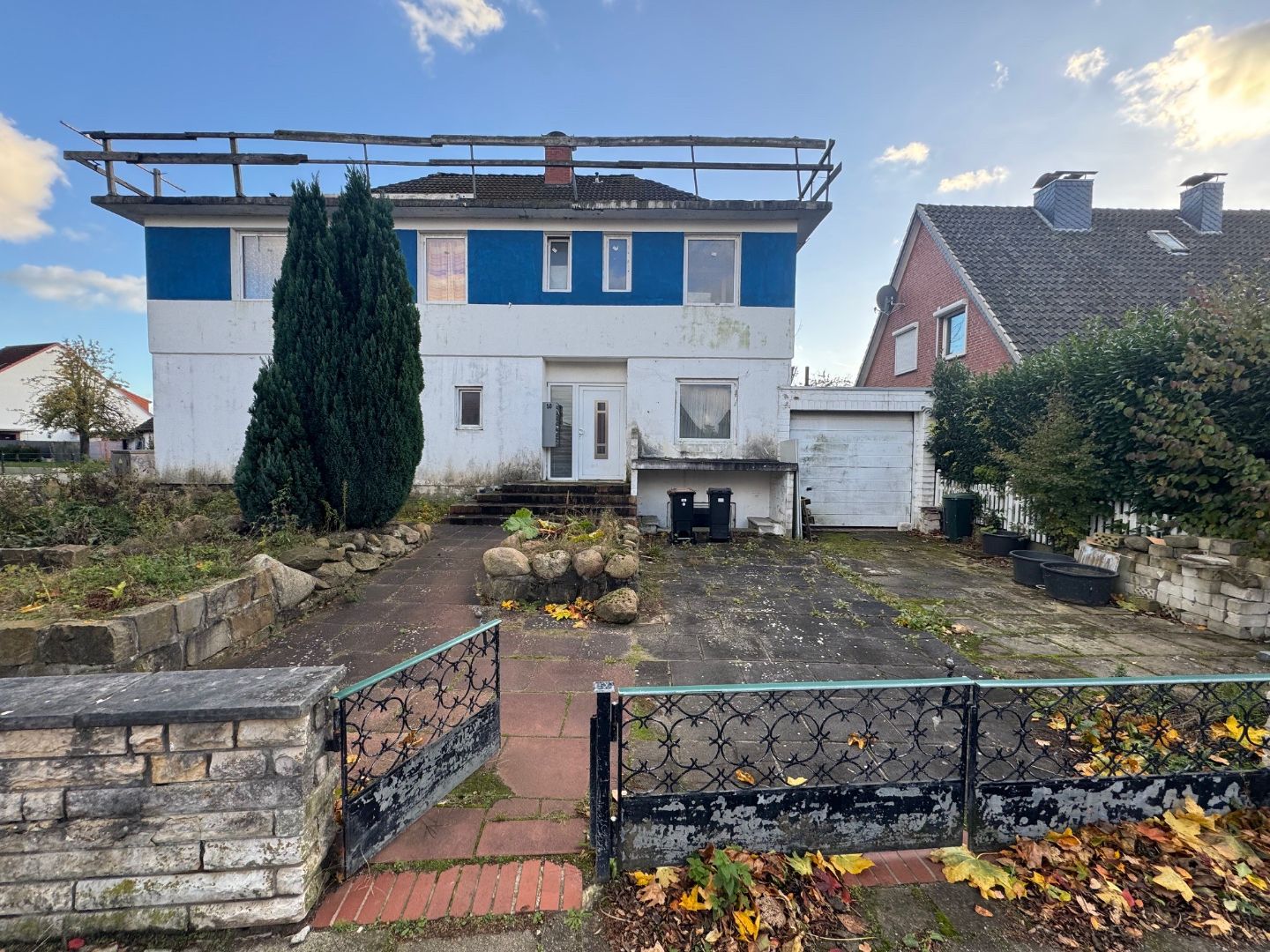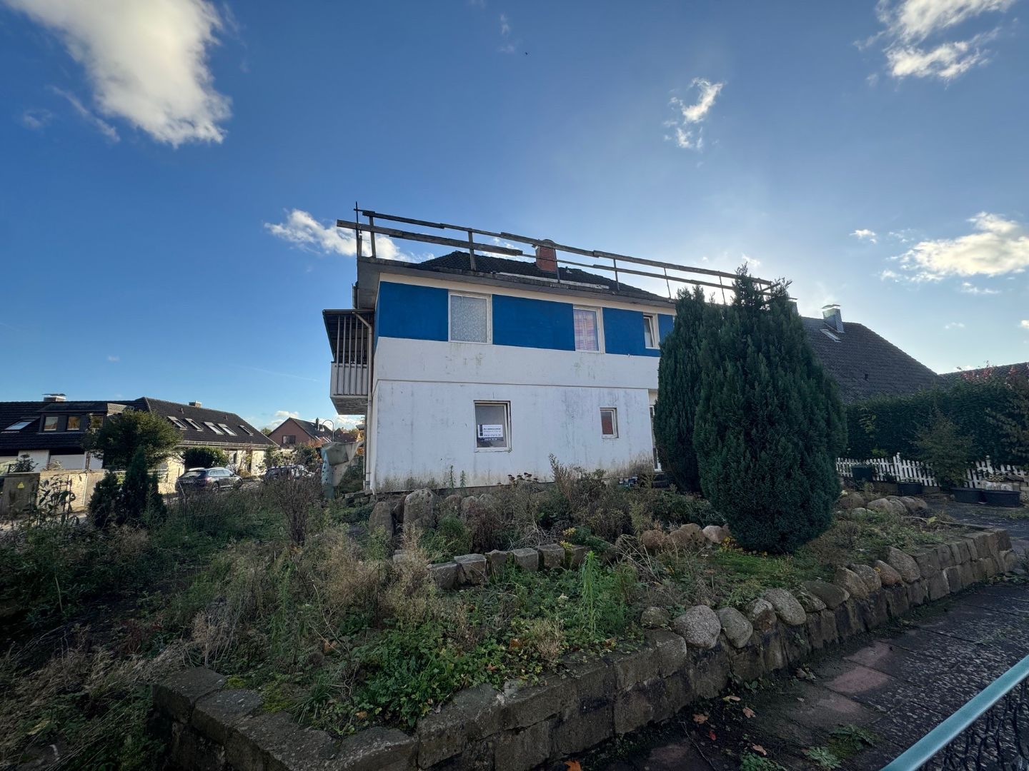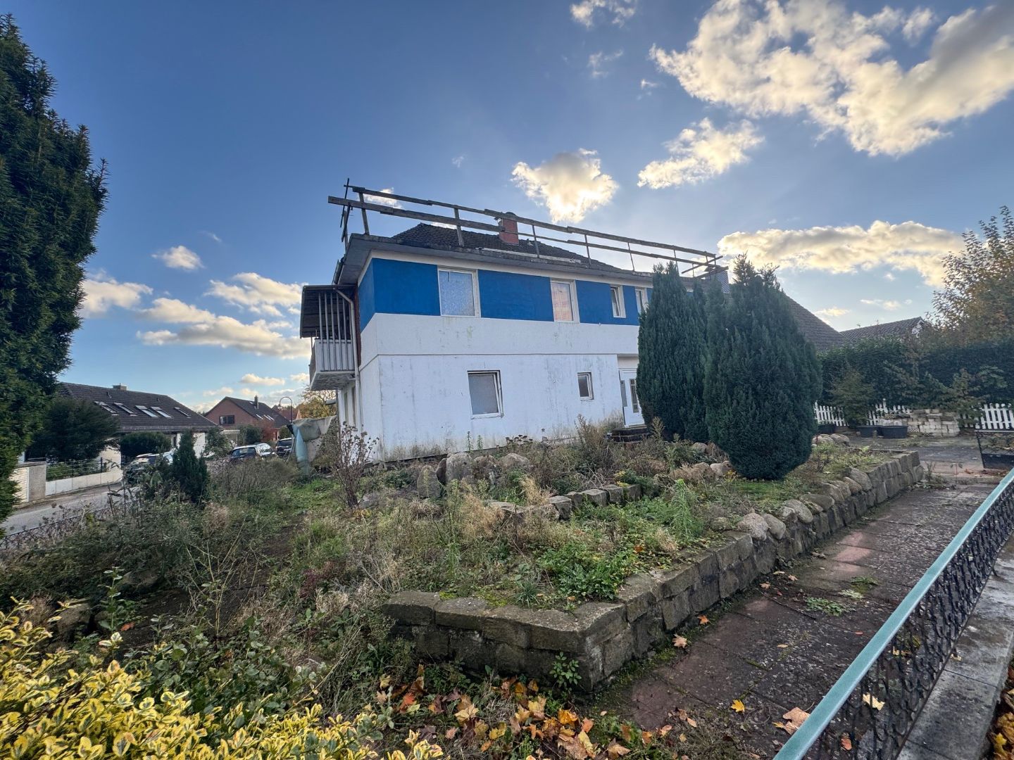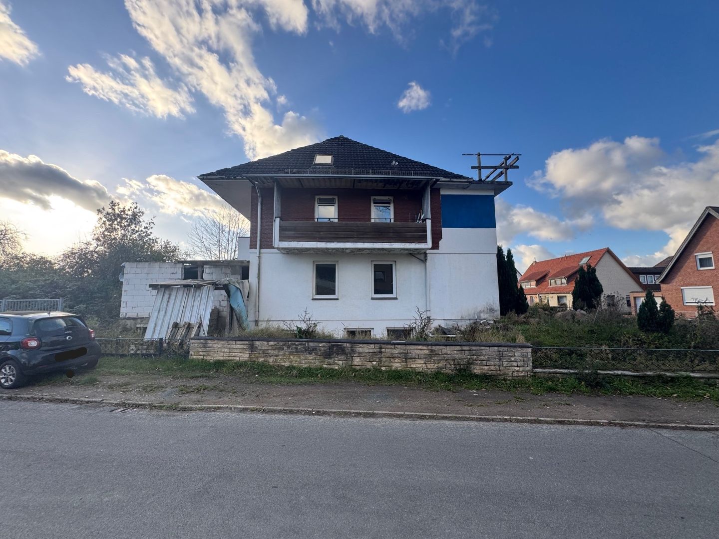 - Das Objekt befindet sich auf einem Eckgrundstück und ist mit einem nicht fertiggestellten Mehrfamilienhaus bebaut.