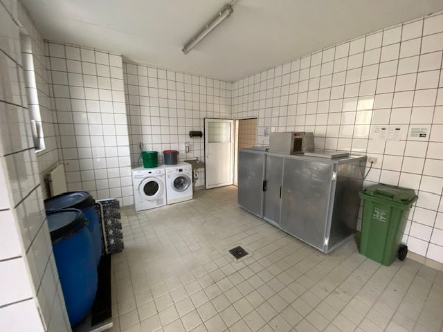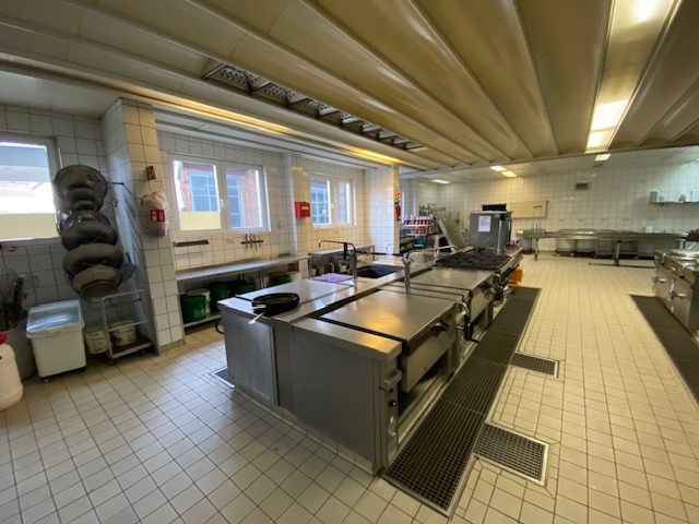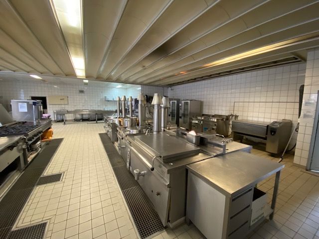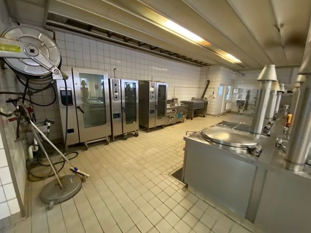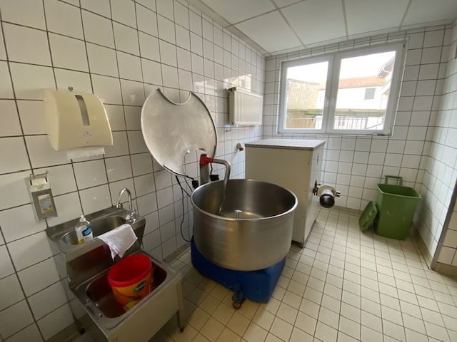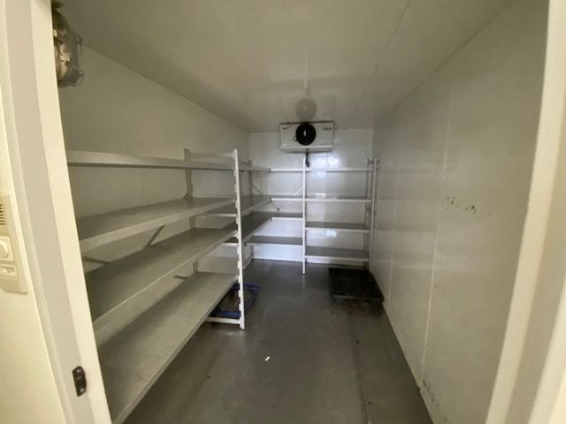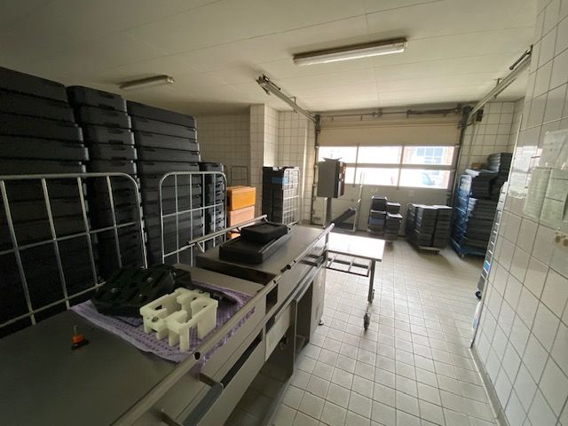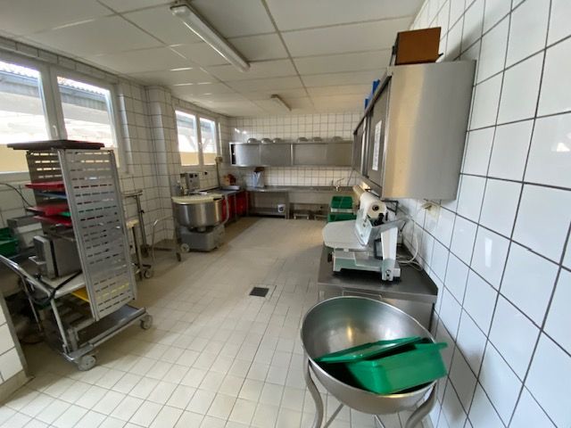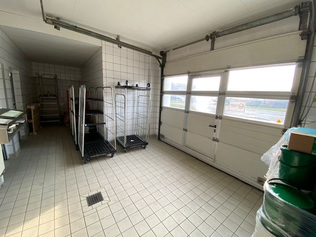 - Es handelt sich um ein massives Gebäude mit drei elektrischen Rolltoren, vier Kühlräumen und einer Tiefkühlkammer. Die Flächen sind aufgeteilt in Warenannahme, Sozialräume, Büro, Lagerflächen sowie die eigentliche Großraumküche.