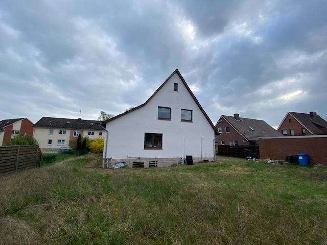 - Massiv gebautes Zweifamilienhaus im Umbauzustand mit Satteldach und verputzter Fassade, zentral auf dem Grundstück gelegen.