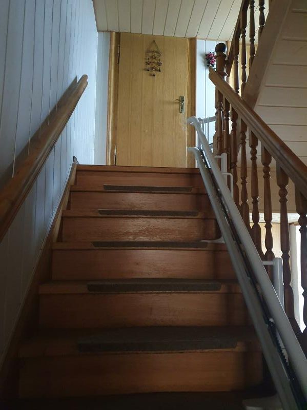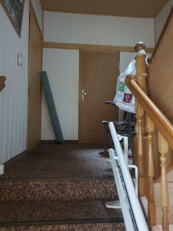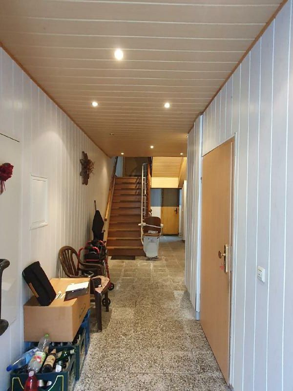 - Treppenaufgang ab erstem Zwischengeschoss ebenfalls mit Teppichbelag, Flur/Eingangsbereich sowie großes Badezimmer der zweiten Wohneinheit im 1. OG ebenfalls mit Teppich, Wohnküche mit Laminat, Wohn- und Schlafzimmer mit Teppich, Decken mit Holzpaneelen verkleidet, ebenso ein Großteil der Wände