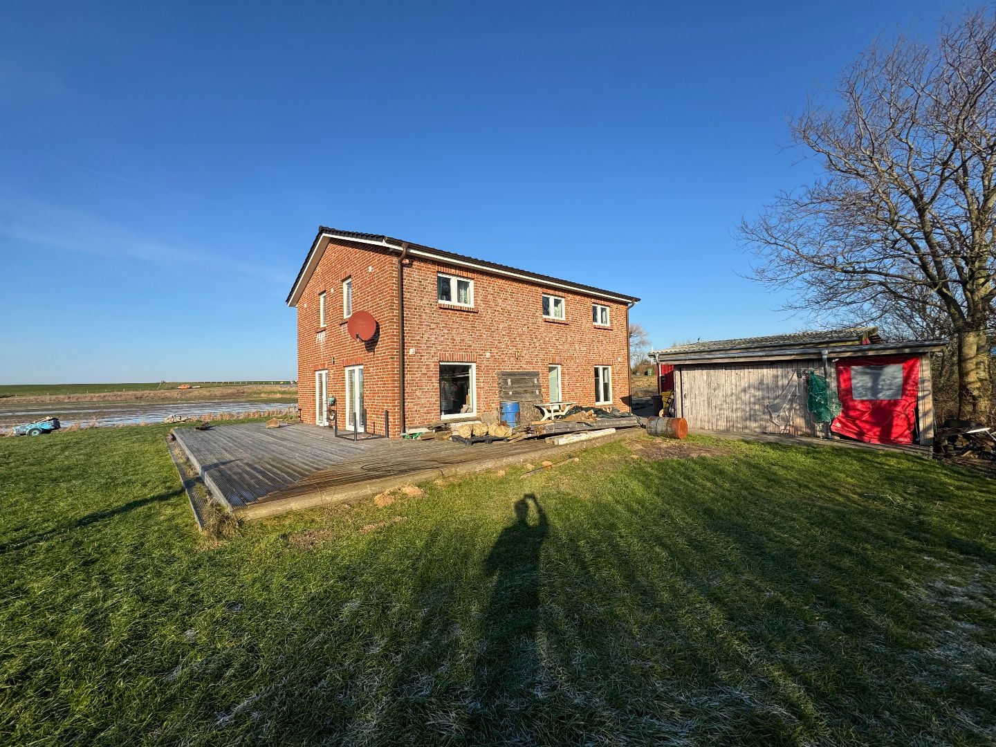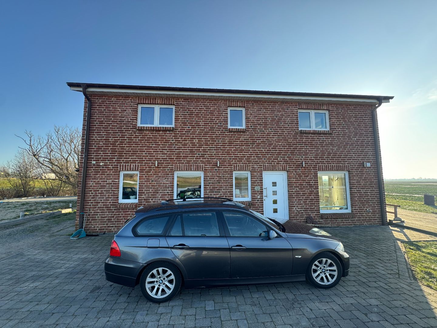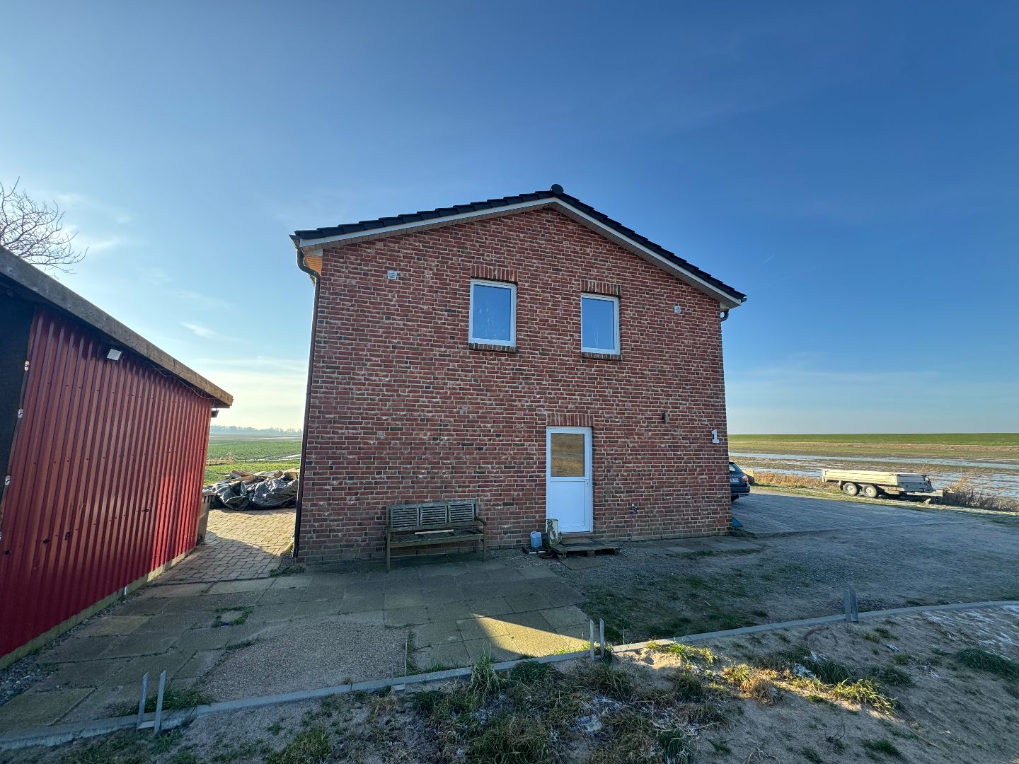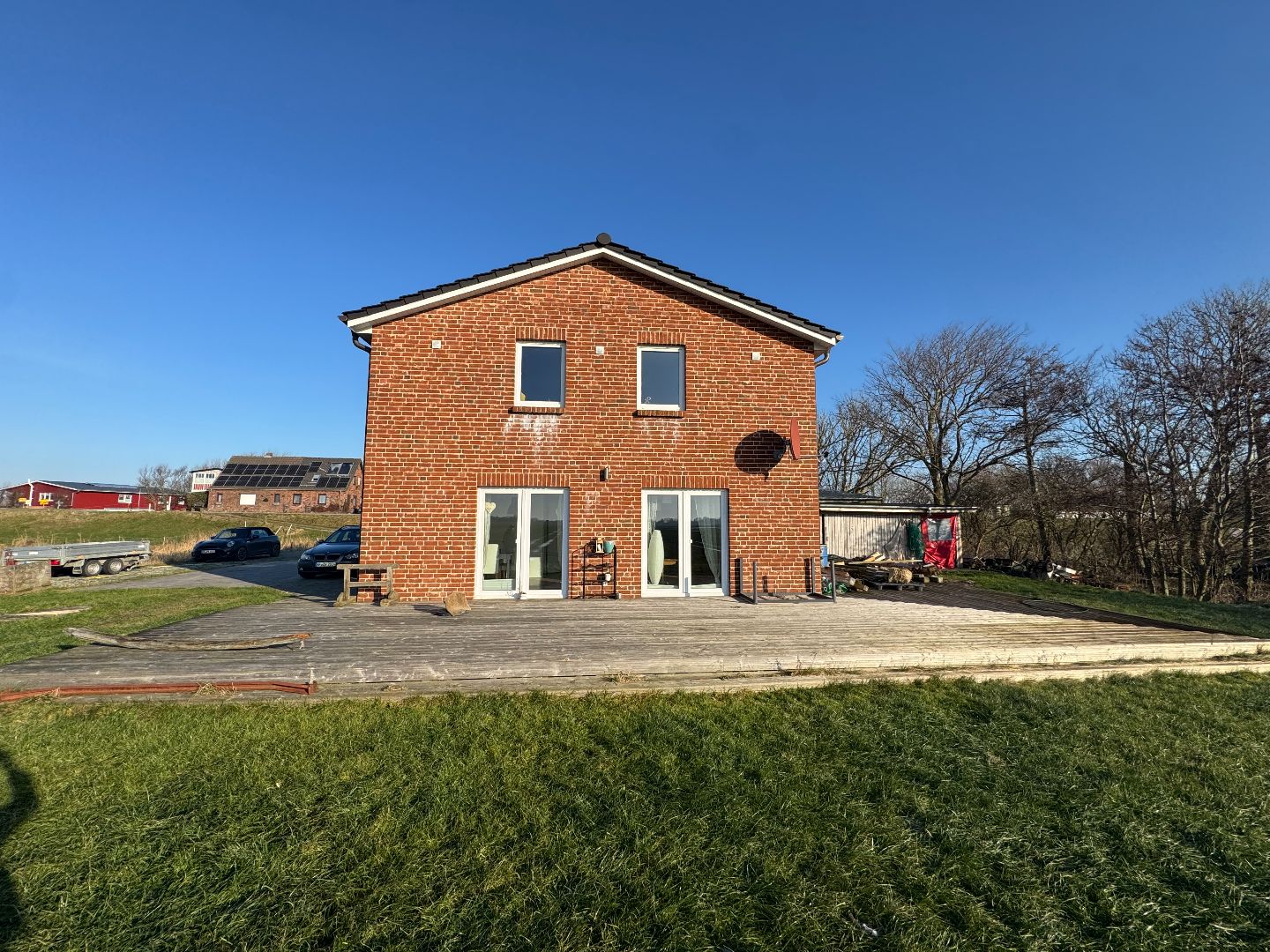 - Die Umgebung ist durch weitere Wohnhäuser sowie angrenzende landwirtschaftlich genutzte Flächen geprägt.