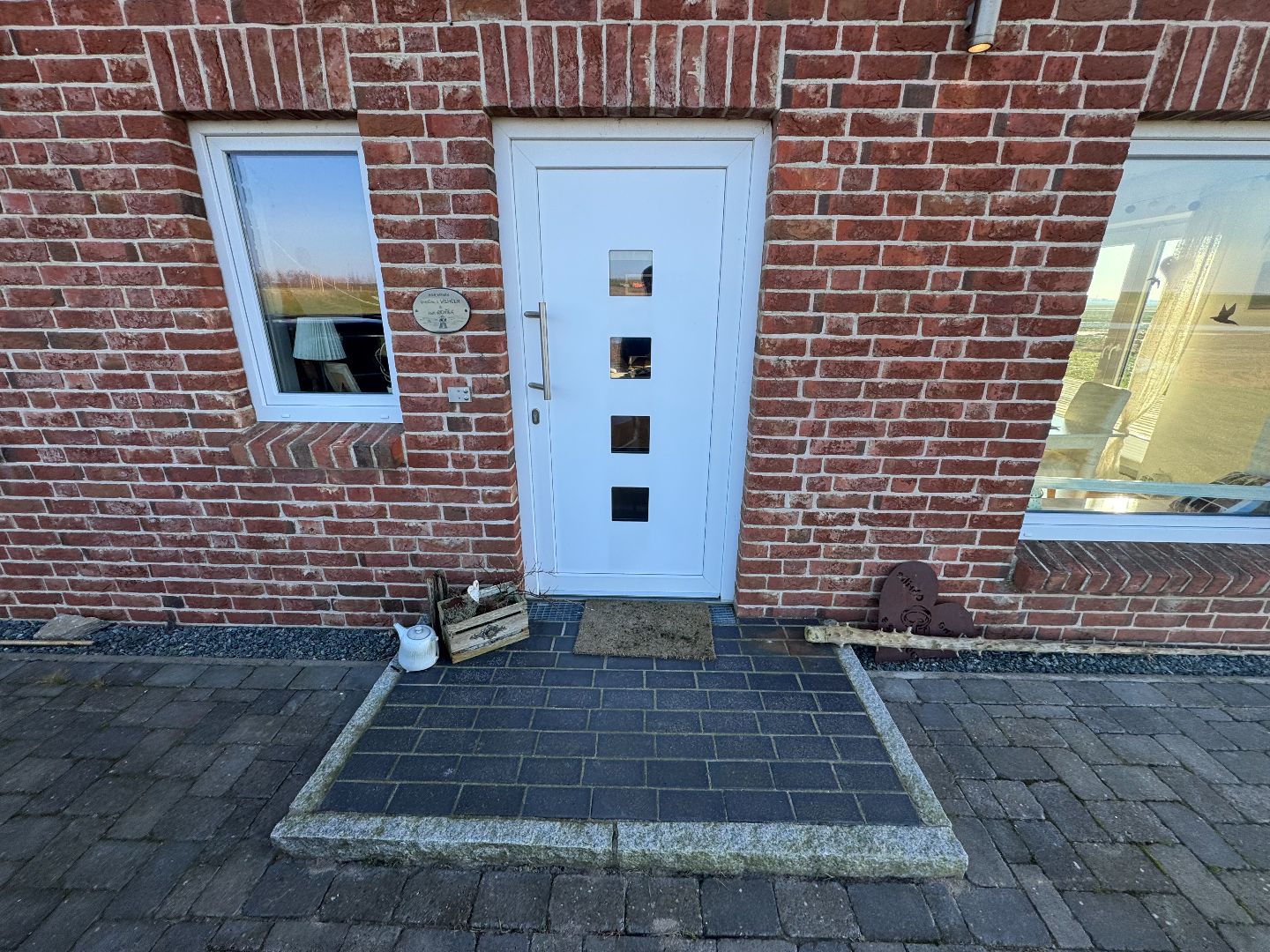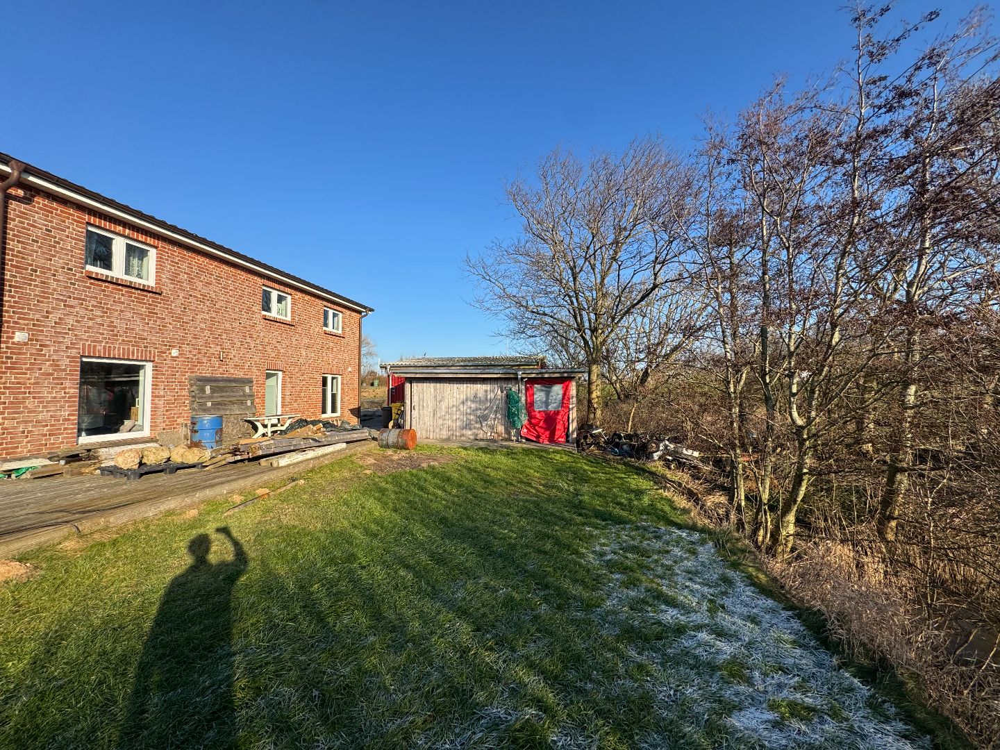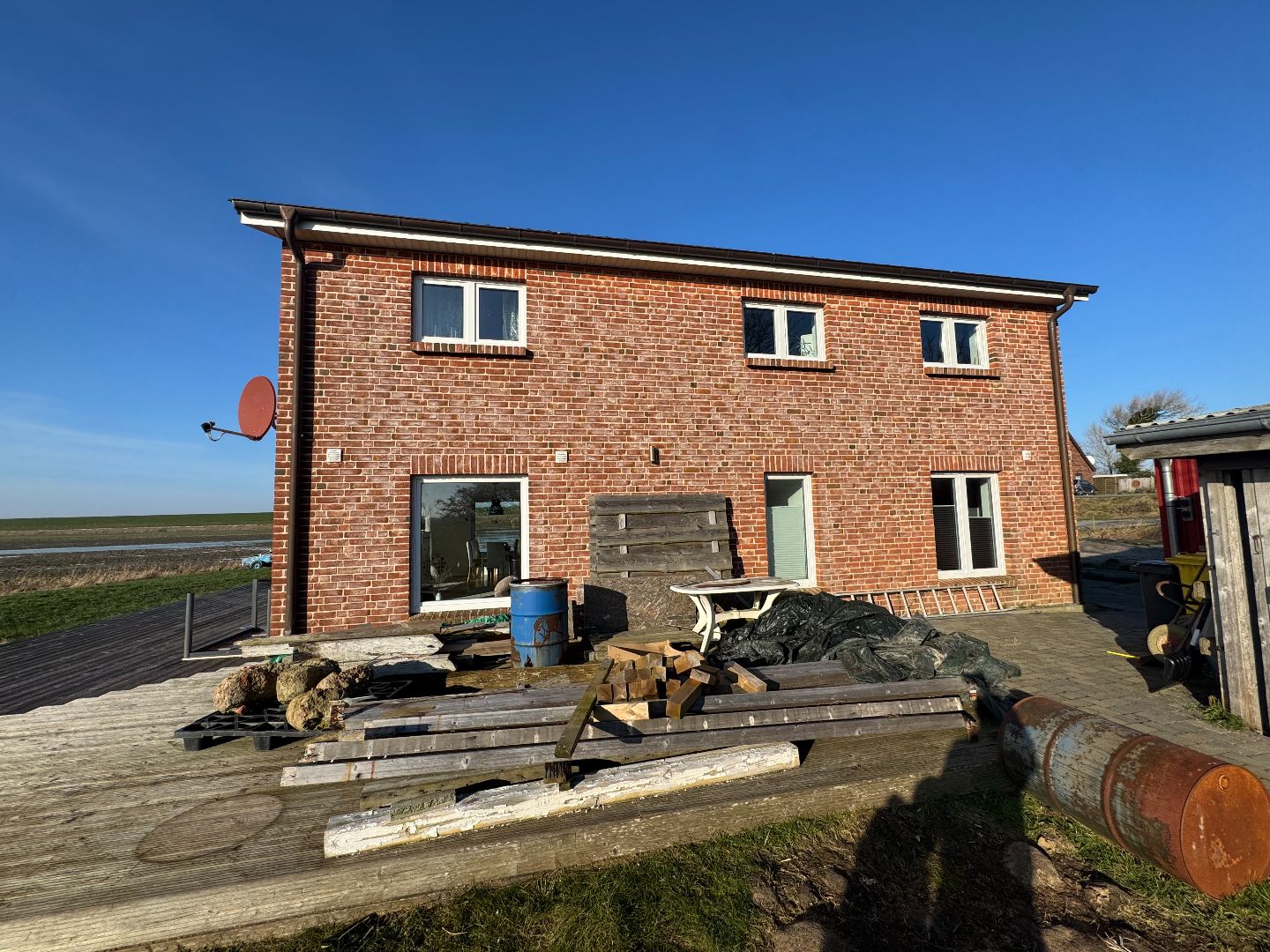- Der vor dem Gebäude angelegte Sandplatz ist bereits für eine spätere Einfriedung vorbereitet, die Einfriedung selbst ist bislang nicht installiert.